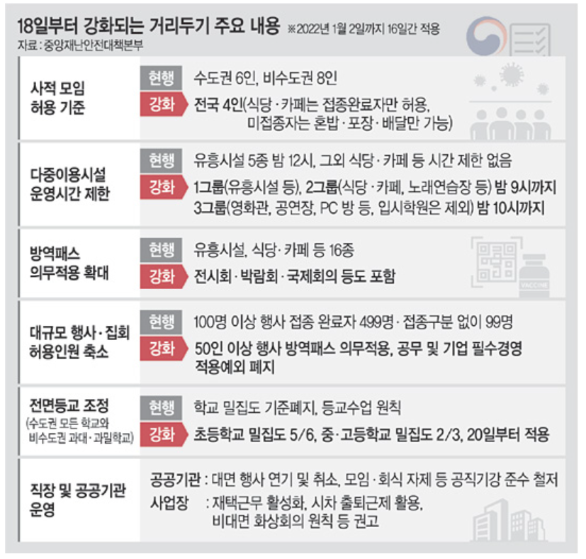 이번 달 18일부터 강화되는 거리두기 주 내용이 발표됐습니다. 2022년 1월 2일까지 16일간 적용할 예정입니다.