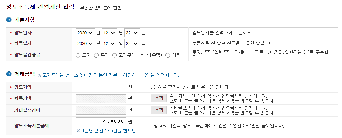 기본사항으로는 양도일자, 취득일자, 양도 물건 종류를 입력하시고, 거래금액과 기타 필요경비를 입력하시면 됩니다. 양도소득 기본공제는 1년에 1회 250만 원 인별로 공제가 됩니다.