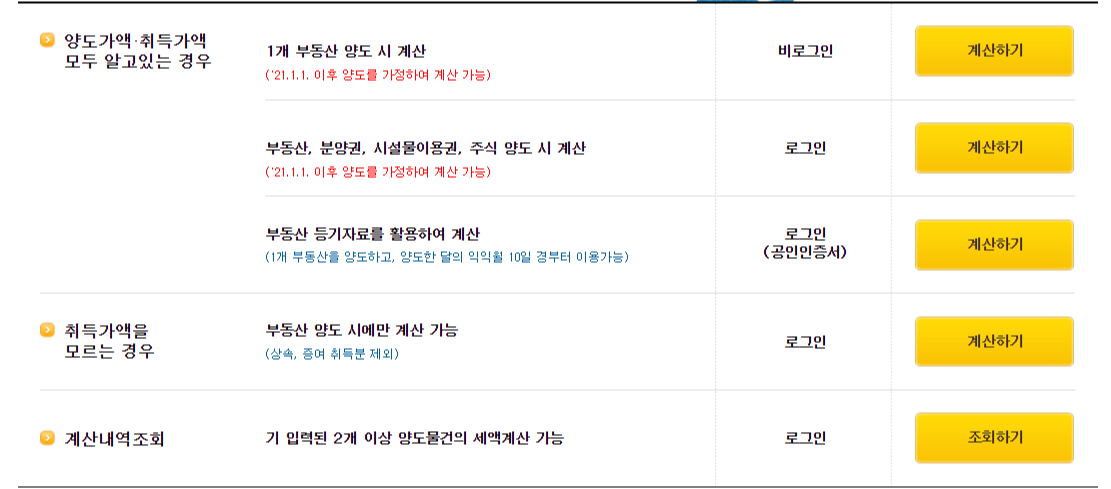 양도소득세는 양도가액과, 취득가액을 알고 있는 경우는 1개 부동산 양도 시와, 부동산, 분양권 시설물 이용권, 주식을 양도하는 경우를 계산할 수 있습니다. 취득가액을 모르는 경우는 부동산 양도 시만 모의계산이 가능합니다.
