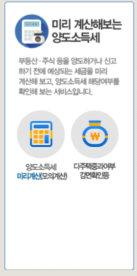 국세청 홈텍스에는 양도소득세 종합부동산세, 부가가치세 등 다양한 세금에 대한 정보를 찾아보실 수 있습니다. 양도소득세의 정보와 양도소득세 자동계산이 궁금하시면 양도소득세를 미리 계산에서 양도소득세를 간편하게 모의 계산할 수 있습니다.