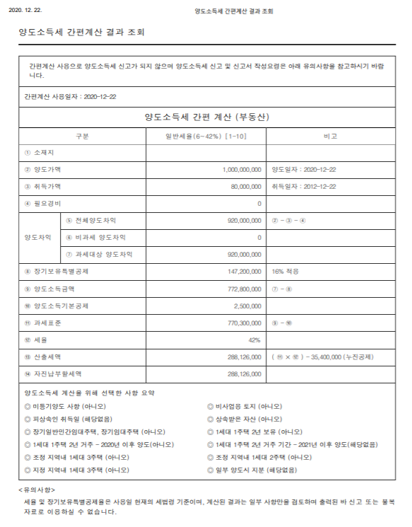 양도 물건지의 내역의 입력이 끝나면 세액 계산하기를 누르시면 인쇄나 PDF 파일로 양도소득세 간편 계산 결과 조회를 받아보실 수 있습니다.