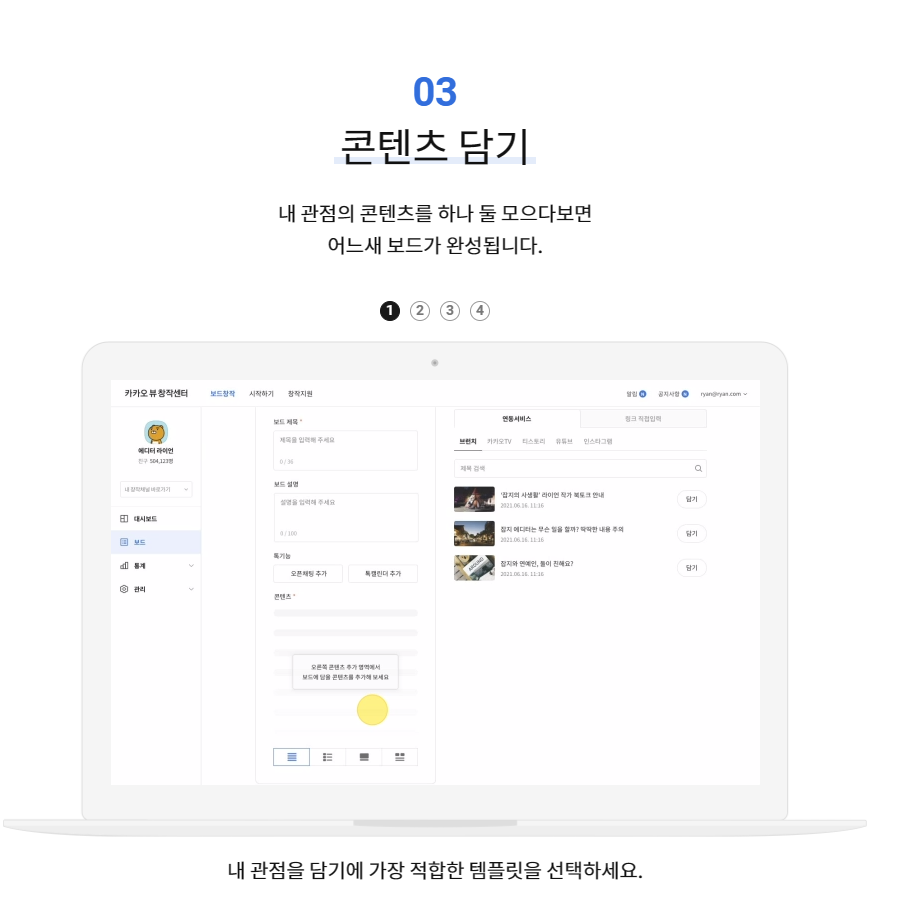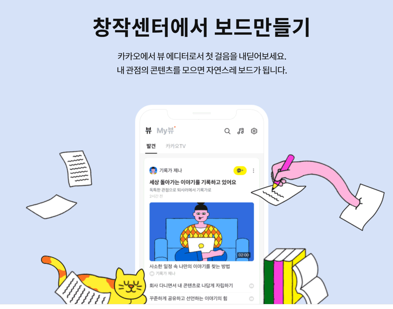 카카오 뷰는 내가 관심이 있고 알려주고 싶은 콘텐츠를 모아서 보드로 발행할 수 있답니다. 유튜브나 블로그 글을 모아 발행할 수도 있고 자신의 티스토리나 유튜브 채널을 연동해서 콘텐츠를 노출시킬 수 있습니다. 내가 만든 콘텐츠를 알릴 수 있고 수익을 낼 수 있는 플랫폼입니다.