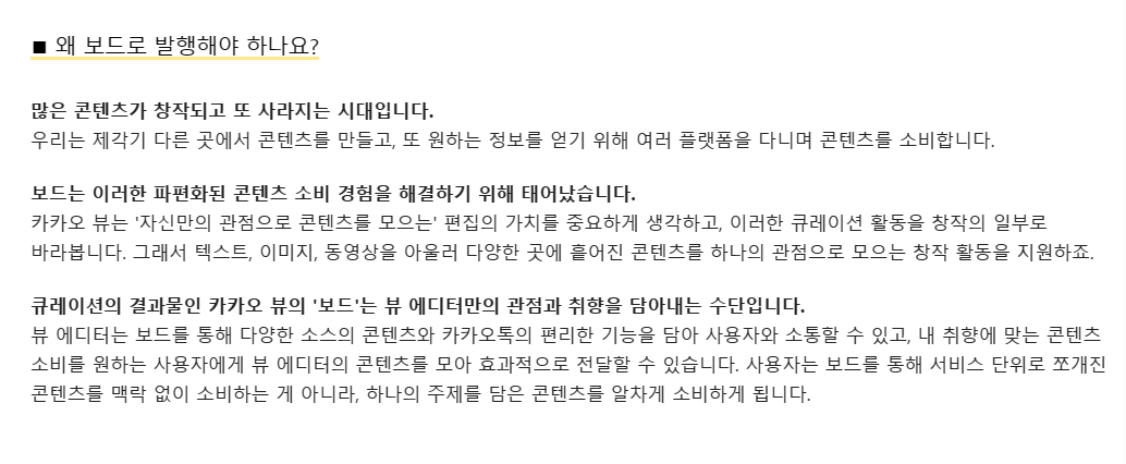 카카오 뷰 보드는 뷰 에디터의 다양한 콘텐츠를 자신만의 관심분야와 취향을 모아서 발행하는 새로운 창작 단위입니다. 미술관의 큐레이션이라고 볼 수 있습니다. 온라인 상의 넘쳐나는 정보 중에서 나만의 관심분야를 쉽게 접할 수 있습니다.