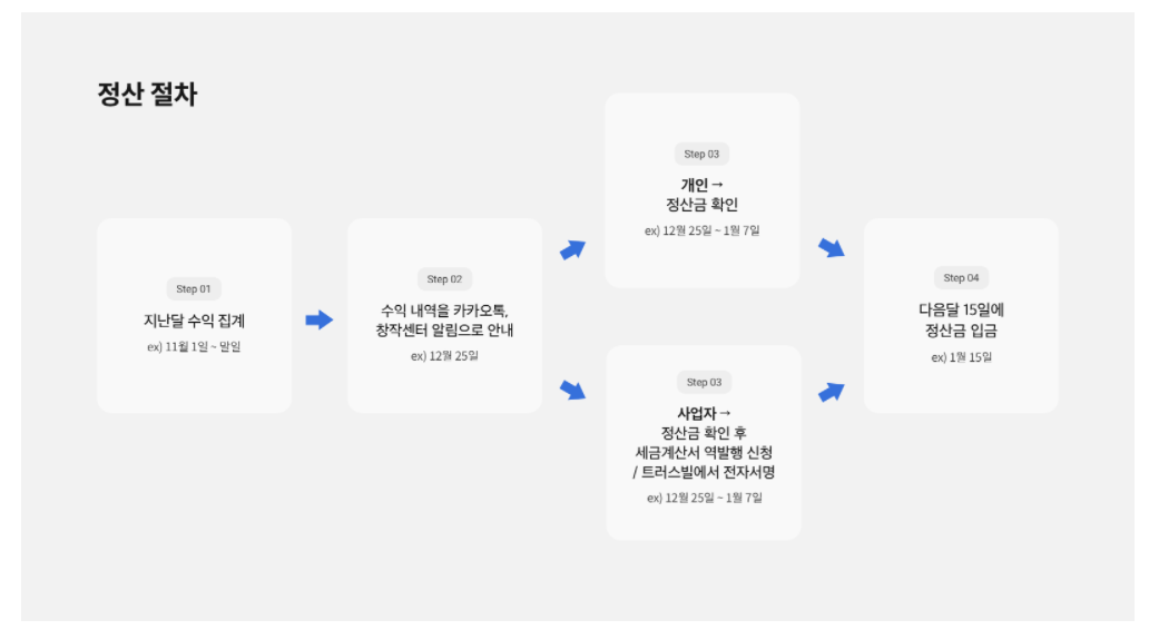 *매월 1일부터 말일까지 수익을 집계하여 다음날 25일에 수익 내역을 카카오톡과 창작센터 알림으로 알려드립니다.