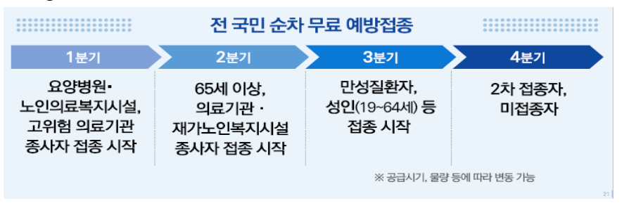 2분기 : 65세 이상, 의료기관, 재가노인복지시설 종사자, 장애인 거주 이용시설 접종 시작( 약 90만 명 백신 예방접종)