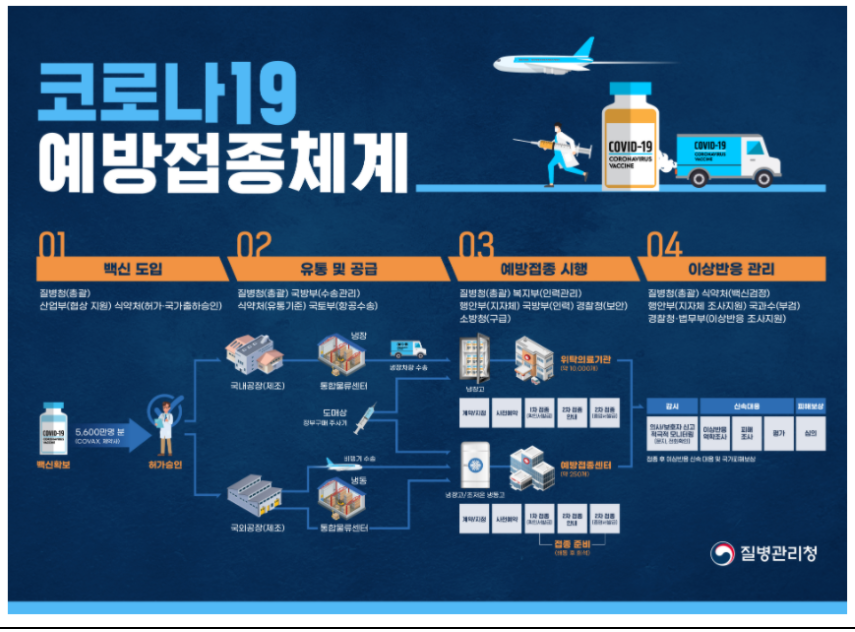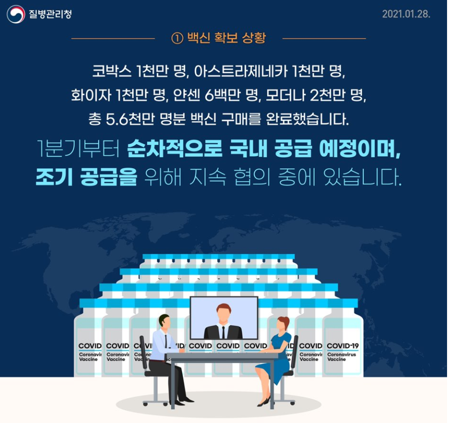 정부는 코백스 퍼실리티 및 아스트라 네네카, 얀센, 화이자, 모더나와 전국 예방접종에 충분한 총 5천600만 명분의 다양한 종류별 백신을 구매 계약했습니다. 노바백스 백신 2천만 병분 계약 추진 등 추가 백신 확보를 위한 노력도 지속하고 있습니다.