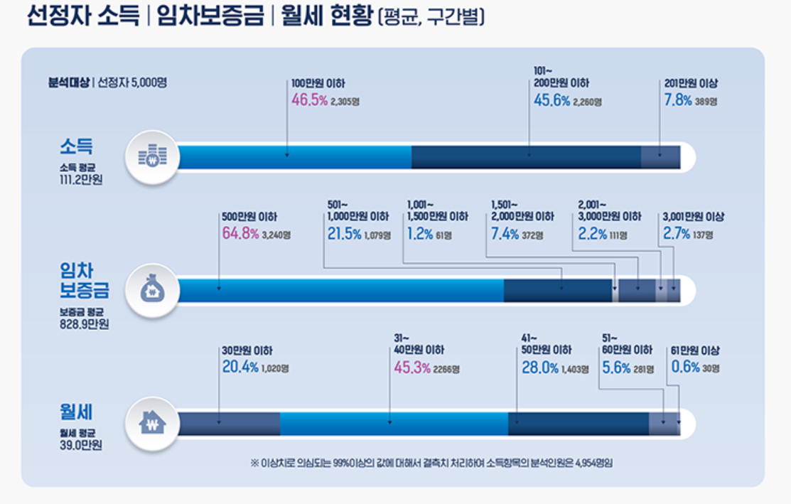 선정기준 : 임차보증금, 월세 및 소득기준, 4개 구간으로 나누어 선정인원 배정