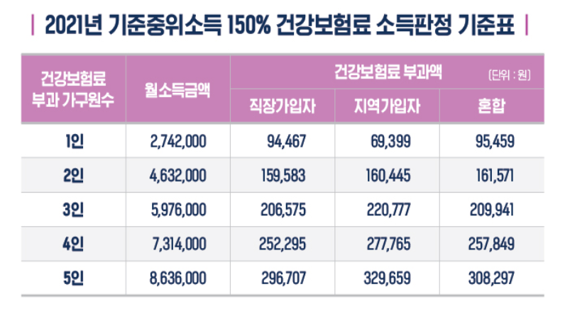 2021년 기준중위소득 150% 건강보험료 소득판정 기준표