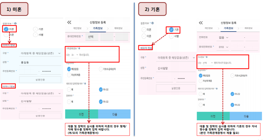 다자녀 정보를 입력할 때는 정확하게 형제, 자매 명수를 입력해야 합니다. 기혼자는 자녀 명수를 입력하면 됩니다. 서류 제출 대상 여부를 확인하신 후 다자녀 증빙 서류를 제출하시길 바랍니다.