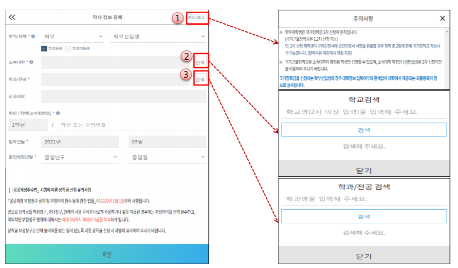 학사정보는 2021년 1학기 기준으로 본인의 학적 구분(신입, 재학, 편입, 재입학)을 정확하게 선택하십시오. 소속 대학 오신청, 학적 오신청 발생 시 심사에 오류가 발생할 수 있으니 정확하게 입력하십시오.