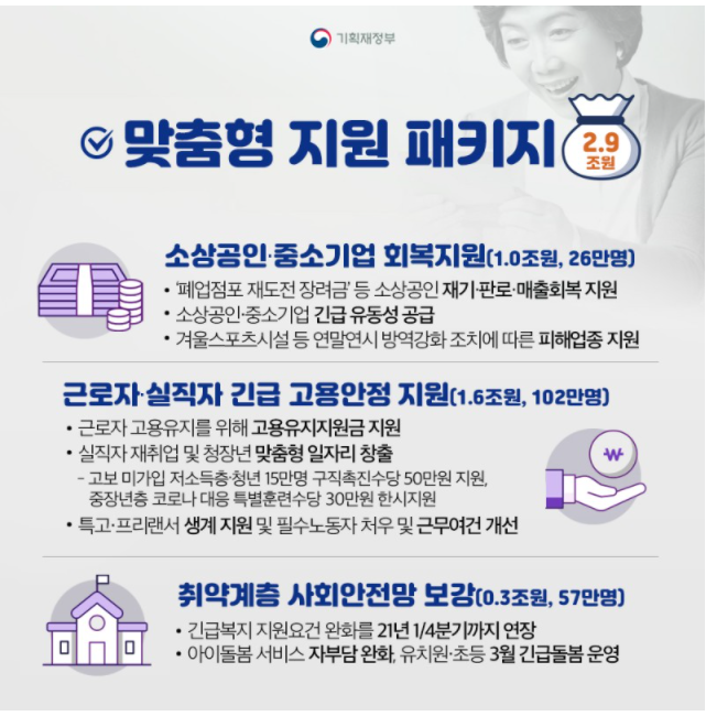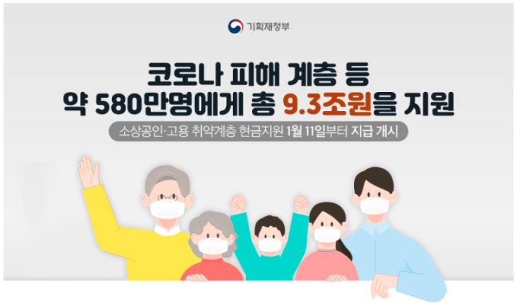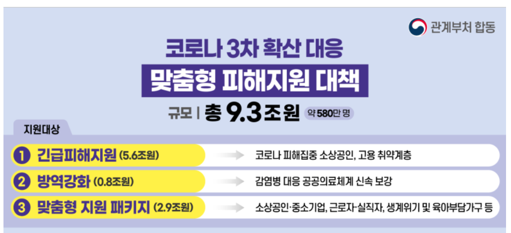 코로나로 피해를 소상공인, 고용 취약계층등 약 580만 명에게 총 9.3조 원을 지원하기로 했다. 긴급 피해지원 5.6조 원, 방역 강화 0.8조 원, 맞춤형 지원 패키지 2.9조 원이 편성됐다.