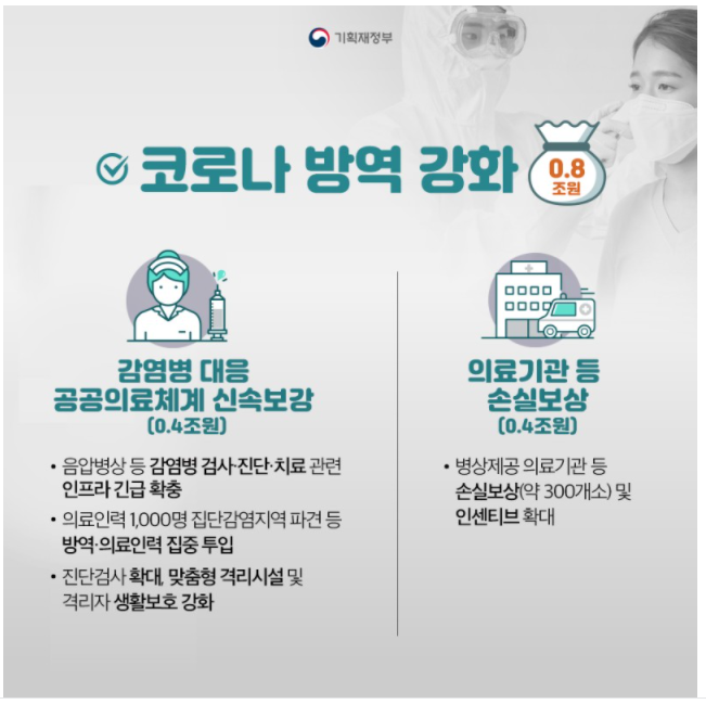 코로나로 피해를 소상공인, 고용 취약계층등 약 580만 명에게 총 9.3조 원을 지원하기로 했다. 긴급 피해지원 5.6조 원, 방역 강화 0.8조 원, 맞춤형 지원 패키지 2.9조 원이 편성됐다.